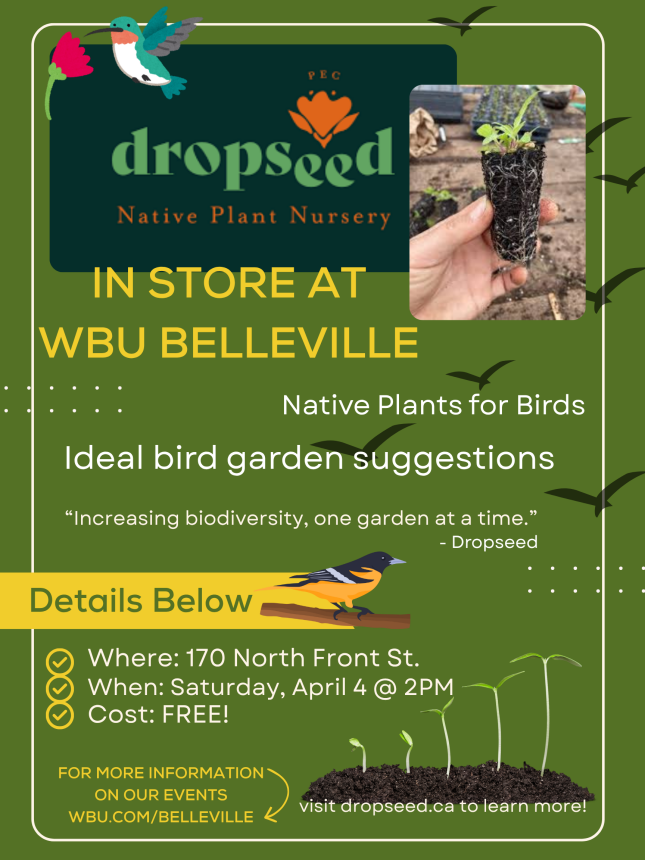 Dropseed, a native plant nursery located in Picton, will be "Dropping in" to our store to talk all about native plant gardens, bird friendly native plants, and ideal bird garden suggestions! This is an event you should be sure to attend! Please visit our Facebook Events page HERE to register for this event!